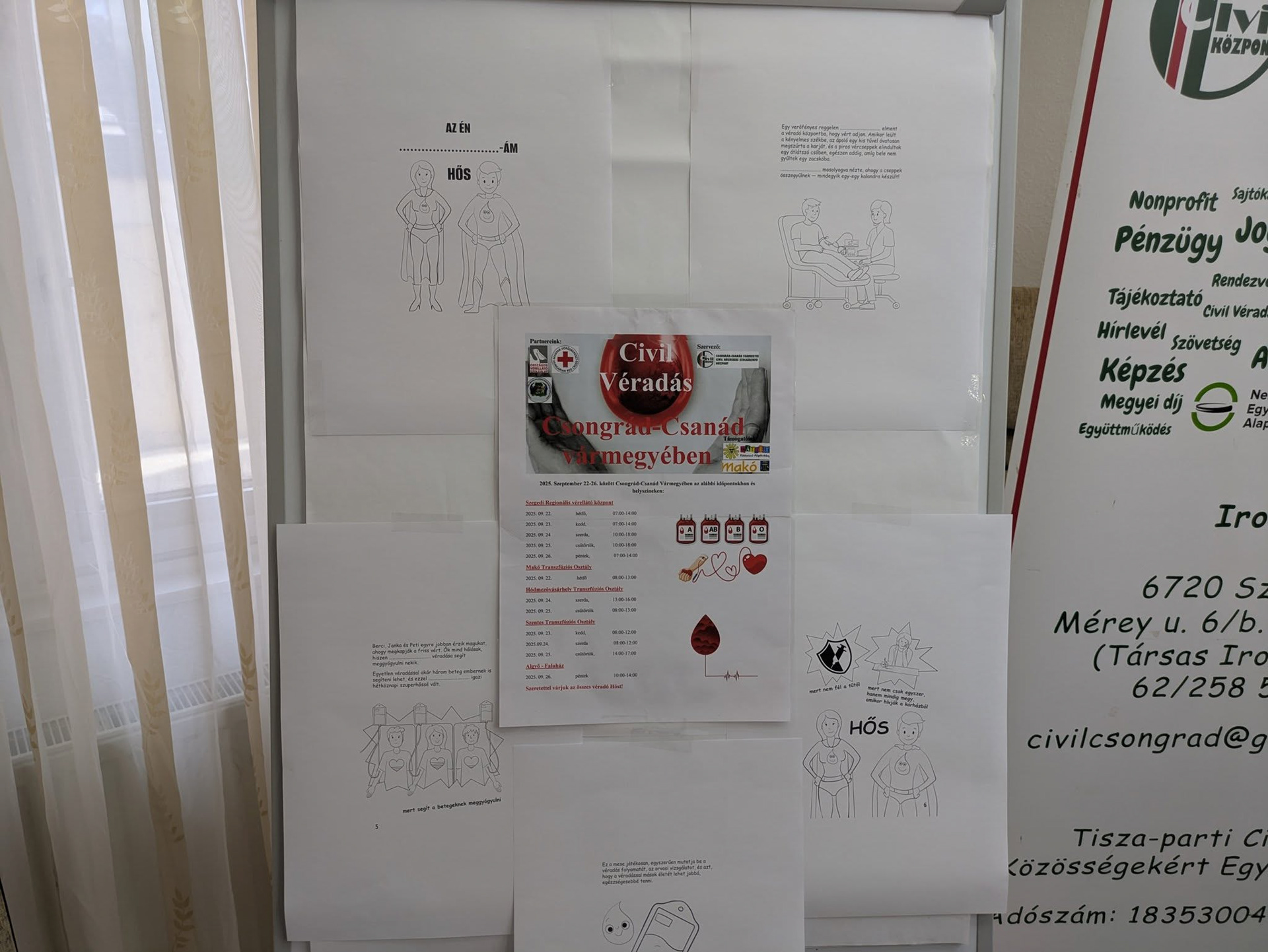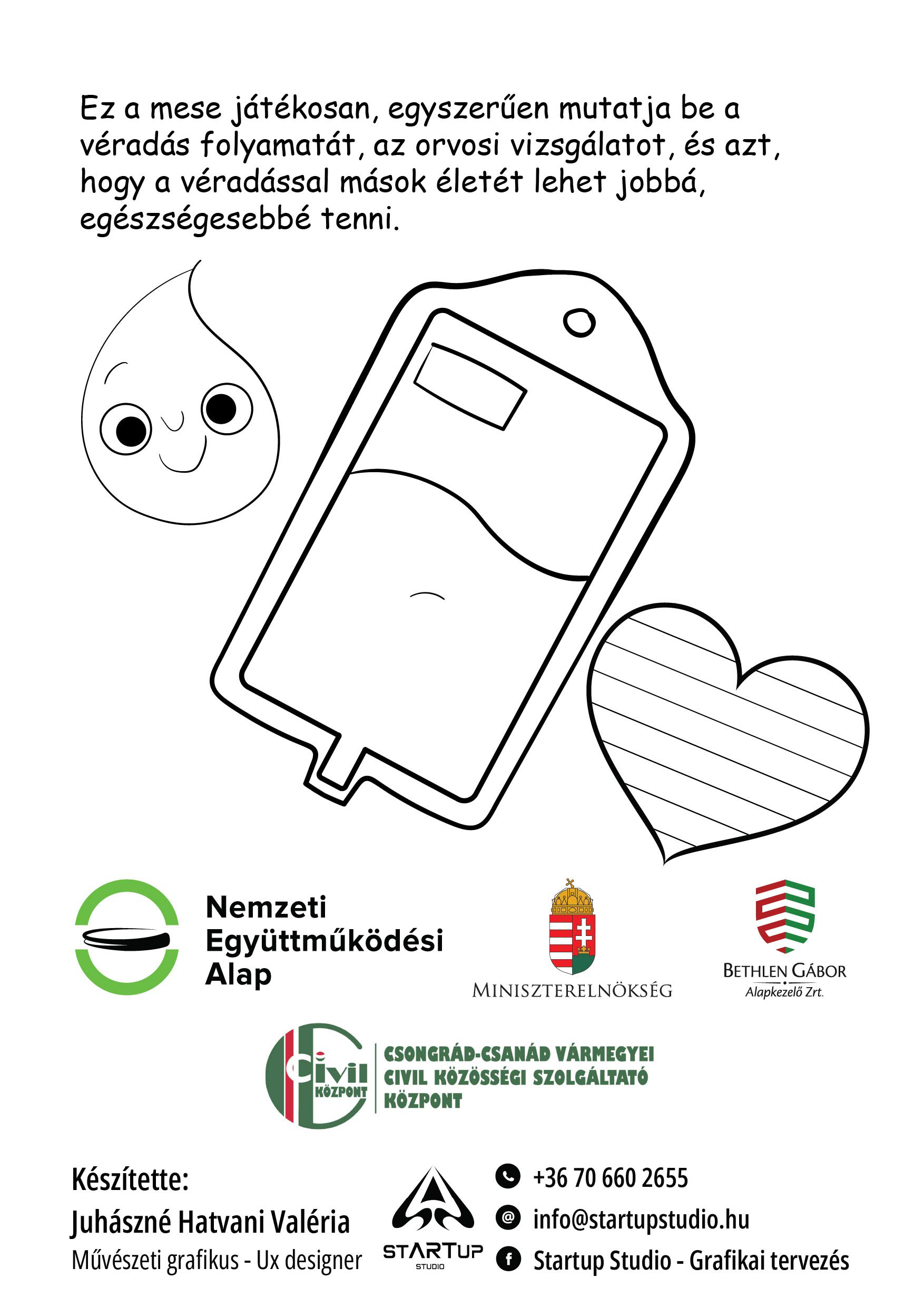 A Csongrád-Csanád Vármegyei Civil Közösségi Szolgáltató Központ felkérésére készült, gyerekeknek szóló színező, amelynek célja a véradás témájának játékos bemutatása volt.